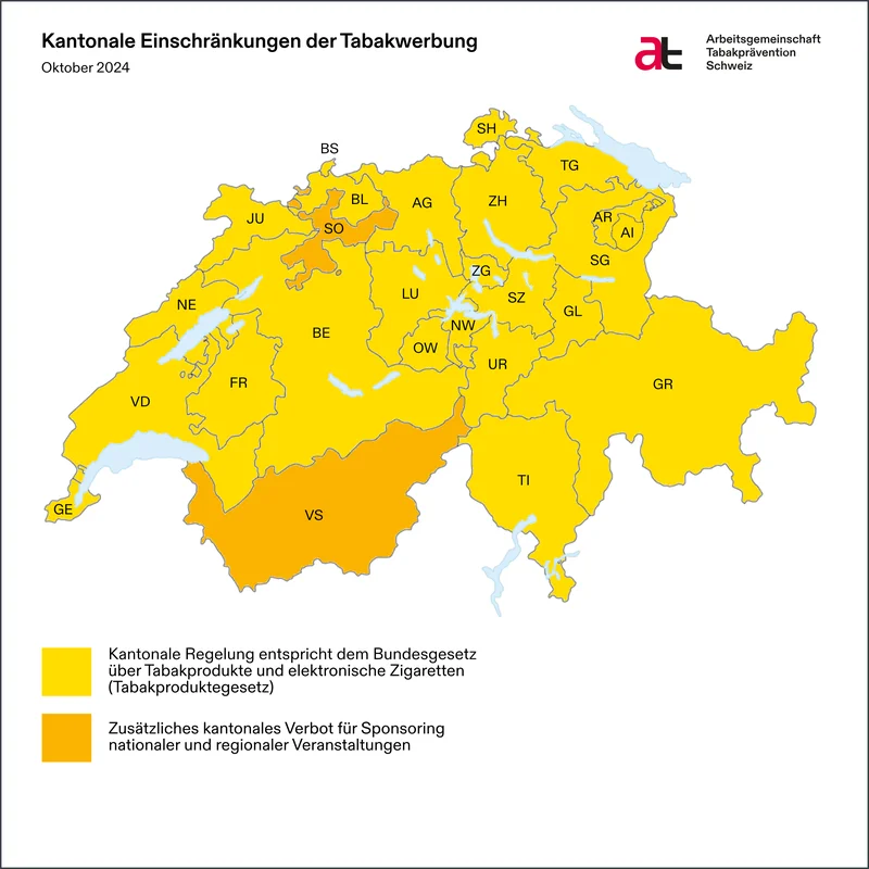 Das Tabakproduktegesetz regelt weitgehend die Werbe-, Promotions- und Sponsoringverbote für Tabakprodukte und E-Zigaretten (Online, Plakate, Kino, Presse etc.). Trotz dieser Harmonisierung der Verbote 2024 kennen einzelne Kantone dennoch weitergehende Einschränkungen.