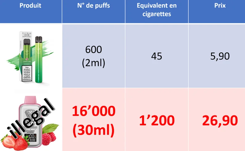 Les normes actuelles en vigueur en Suisse se basent sur une Directive européenne de 2014 qui est très claire : chaque cigarette électronique à système dit fermée ne peut pas contenir plus de 2 ml de volume de e-liquide et ne doit pas contenir plus de 20 mg/ml de nicotine. Le réservoir de ces systèmes par capsules (aussi appelées pods) ou jetables devrait ainsi pouvoir délivrer au maximum 600 bouffées qui correspondent au volume de 2ml d’e-liquide. Pourtant, il est actuellement possible de commander en ligne des cigarettes électroniques promettant jusqu’à 16’000 bouffées et avec un réservoir de 30ml, soit 15 fois plus que la limite légale. L’enquête d’AT Suisse estime que plus de la moitié des cigarettes jetables sur le marché suisse enfreint cette norme et elles sont par conséquent vendues illégalement.